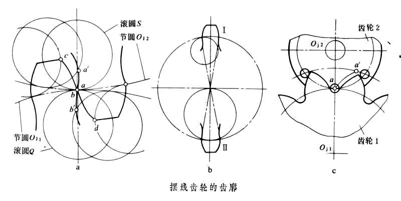 擺線齒輪組成的齒輪傳動。擺線齒輪的齒廓由內(nèi)擺線或外擺線組成(圖中a[